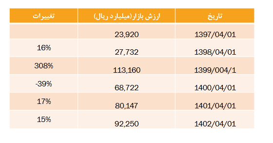 بیشترین ارزش بازار های وب در مرداد ۹۹ بوده است. ارزش بازار های وب در سال ۱۴۰۲ مبلغ ۹۲۲۵۰ میلیارد ریال پیش بینی شده است که ۱۵ درصد تغییر دارد. P/E شرکت در تاریخ ۱۴۰۲/۰۴/۰۱ حدود ۲.۶ واحد است و P/S شرکت ۲ دهم است.