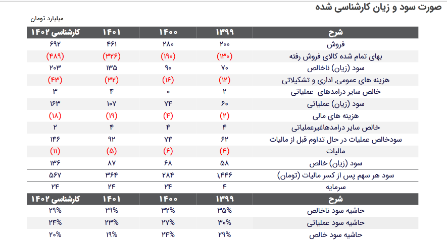 این رقم برای دوره مالی منتهی به ۱۴۰۱ مبلغ ۴۶۱ میلیارد تومان است. سود عملیاتی شرکت مبلغ ۱۰۷ میلیارد تومان است. سود هر سهم پس از کسر مالیات شرکت برای سال مالی منتهی به ۱۴۰۲ مبلغ ۵۶۷ میلیارد تومان است.