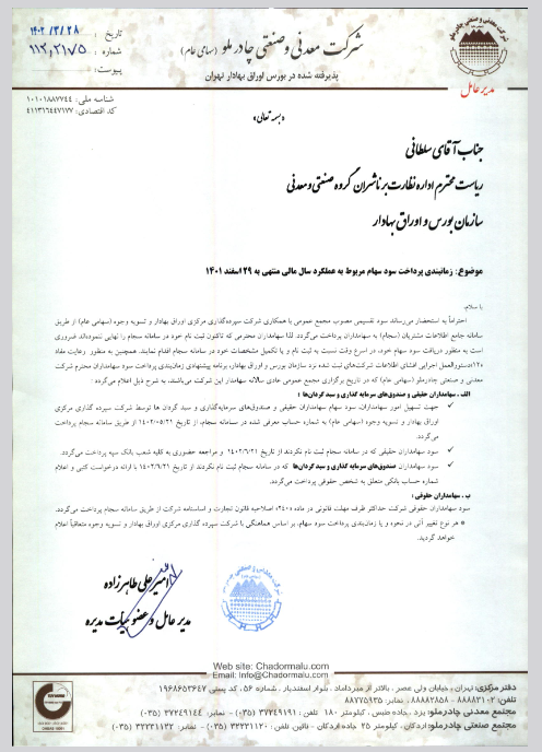 شرکت صنعتی و معدنی چادرملو از زمان پرداخت سود به سهامدارانش خبر داد.