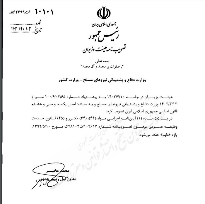 به گزارش اکونگار به نقل از ایرنا، هیات وزیران در جلسه ۱۰ تیرماه جاری به پیشنهاد وزارت دفاع و پشتیبانی نیروهای مسلح و به استناد اصل ۱۳۸ قانون اساسی، بند (ذ) ماده (۱) آیین نامه اجرایی مواد (۴۴)، (۴۴) مکرر و (۴۵) قانون خدمت وظیفه عمومی را اصلاح کرد.