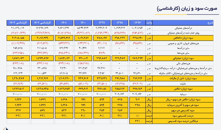 درآمدهای عملیاتی شرکت برای دوره مالی منتهی به ۱۴۰۳ مبلغ ۲۱۱۲۹۰۱۹ میلیون ریال و برای ۱۴۰۲ مبلغ ۱۷۳۹۷۱۶۹ میلیون ریال است این قرم در مدت مشابه منهی به ۱۴۰۱ مبلغ ۹۷۶۱۳۴۷ میلیون ریال اعلام شد.