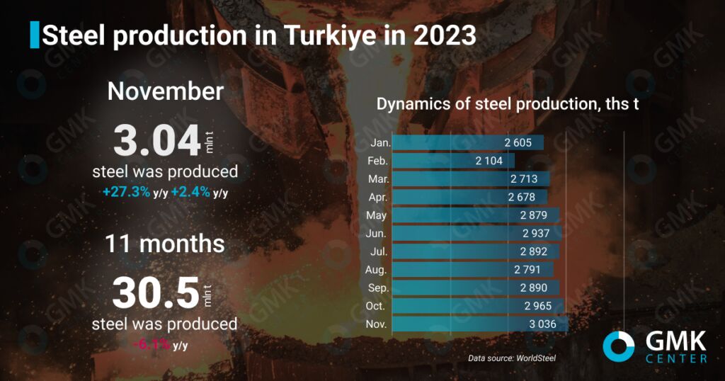 ضمن اینکه در ژانویه تا نوامبر ۲۰۲۳، فولاد سازان ترکیه ۳۰.۴۹ میلیون تن فولاد تولید کردند که ۶.۱ درصد نسبت به مدت مشابه در سال ۲۰۲۲ کاهش داشت. همچنین بر اساس این گزارش، میانگین تولید ماهانه فولاد در ترکیه در ژانویه تا نوامبر ۲۰۲۳ به ۲.۷۷ میلیون تن رسید که ۶.۱۱ درصد نسبت به سال قبل کاهش داشت. نکته قابل تامل در این گزارش اینکه از اکتبر ۲۰۲۳، ترکیه قیمت گاز طبیعی عمده فروشی برای شرکت های صنعتی بزرگ را ۲۰ درصد نسبت به ماه اوت افزایش داده است.