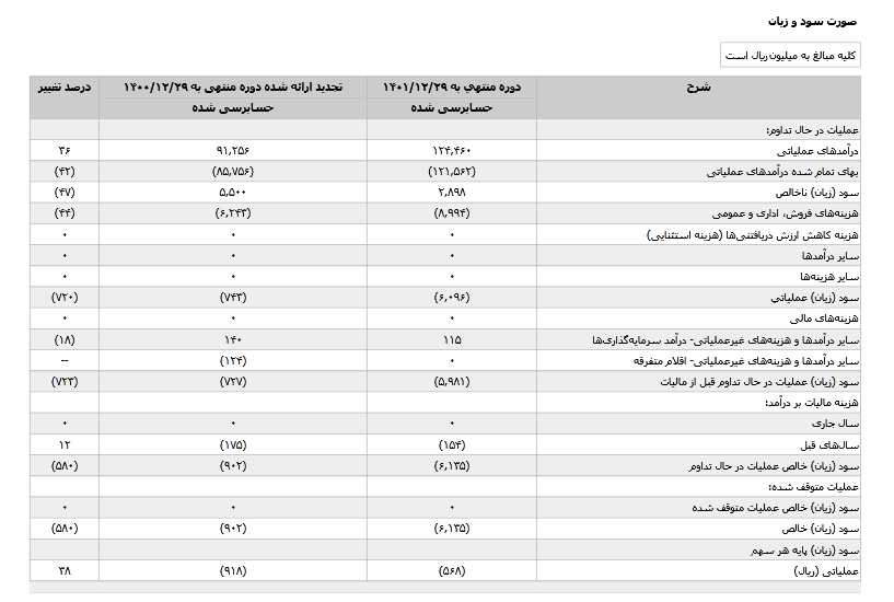 بر اساس بررسی گزارش اطلاعات و صورت های مالی ۱۲ ماهه منتهی به ۱۴۰۱/۱۲/۲۹ (حسابرسی شده) شرکت تامین کالای کیسون ،درآمدهای عملیاتی منتهی به ۱۴۰۱/۱۲/۲۹ را مبلغ ۱۲۴۴۶۰ میلیون ریال اعلام کرد این رقم برای دوره مالی منتهی به ۱۴۰۰/۱۲/۲۹ مبلغ ۹۱۲۵۶ میلیون ریال بود. سود زیان عملیاتی شرکت (۶۰۹۶) میلیون ریال است.