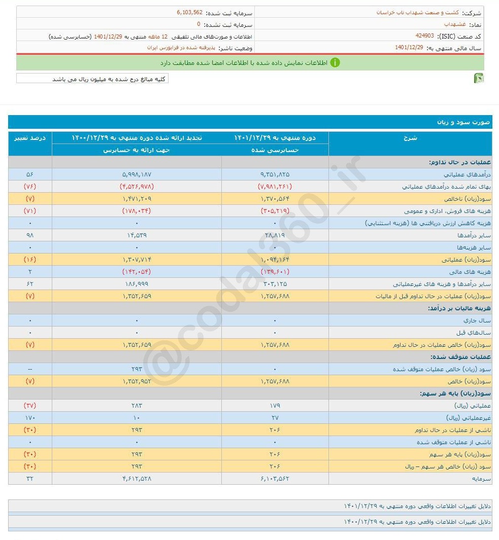 بر اساس بررسی گزارش صورت‌های مالی تلفیقی سال مالی منتهی به ۱۴۰۱/۱۲/۲۹ (حسابرسی شده) شرکت کشت و صنعت شهداب ناب خراسان که با نماد غشهداب در بورس فعالیت دارد؛